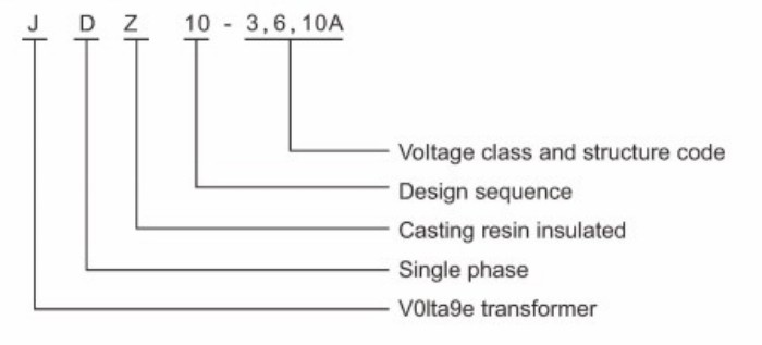 J = transformátor napětí, D = jednofázový, Z = izolace z epoxidové pryskyřice, 3/6/10 = úroveň napětí.